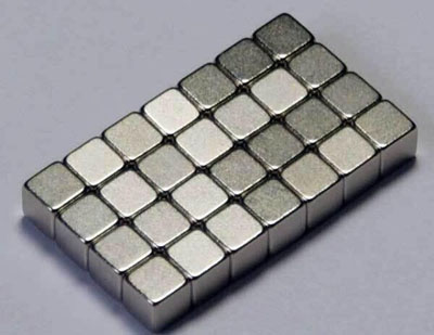 稀土材料因為具備非常好的磁特性,對于制備風力渦輪機,電動汽車和混合動力汽車以及家用電子器件至關重要。但是同時他們也具有價格敖貴和來源單一(只有中國有)的特點。然而,根據美國電子能源公司的消息,電動機使用磁鐵將電能轉換成機械能,一個很小尺寸的燒結的稀土磁體便能夠產生非常強大的磁場,這使制造商能夠制備更小和更輕的汽車成為可能。這家公司已經與美國特拉華大學研究人員合作以尋找一種能夠將稀土磁鐵的電阻率提高至少30%的制備工藝。他們的目標是利用電阻率增加的磁鐵即使在汽車高速運轉時也能降低發動機的效率損失。上圖便是塊狀的鍍鎳的釹磁鐵,是世界上使用最廣泛的一種稀土磁鐵之一。