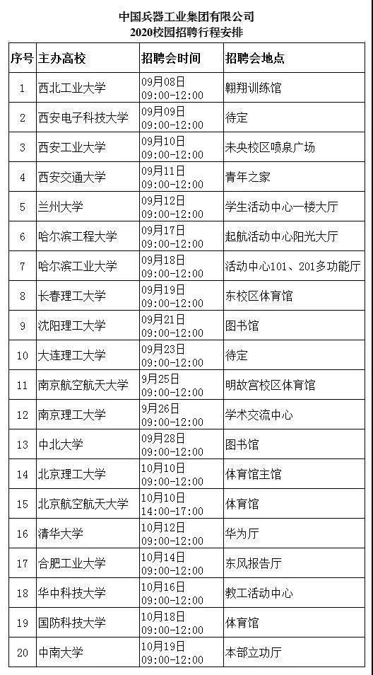 中國兵器工業集團2020屆校園招聘會將在全國12個城市、20所高校舉辦,招聘會具體行程見下表: