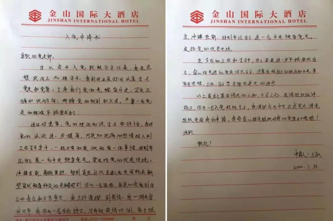 1月30日,在武漢戰“疫”第一線,短短的兩天,讓青年護士王敏、王曉霞最驚訝、最感動的就是防控疫情黨員先行,最危急的關頭、最危險的地方總有共產黨員沖在前面,“我是黨員我先上”成為最響亮的口號。到達武漢的第二天,她們就向內蒙古衛健委成立的援助武漢臨時黨支部遞交了入黨申請書。她們表示,要在武漢防疫一線努力工作,向黨員同志學習、看齊,以實際行動早日成為一名正式的共產黨員!
