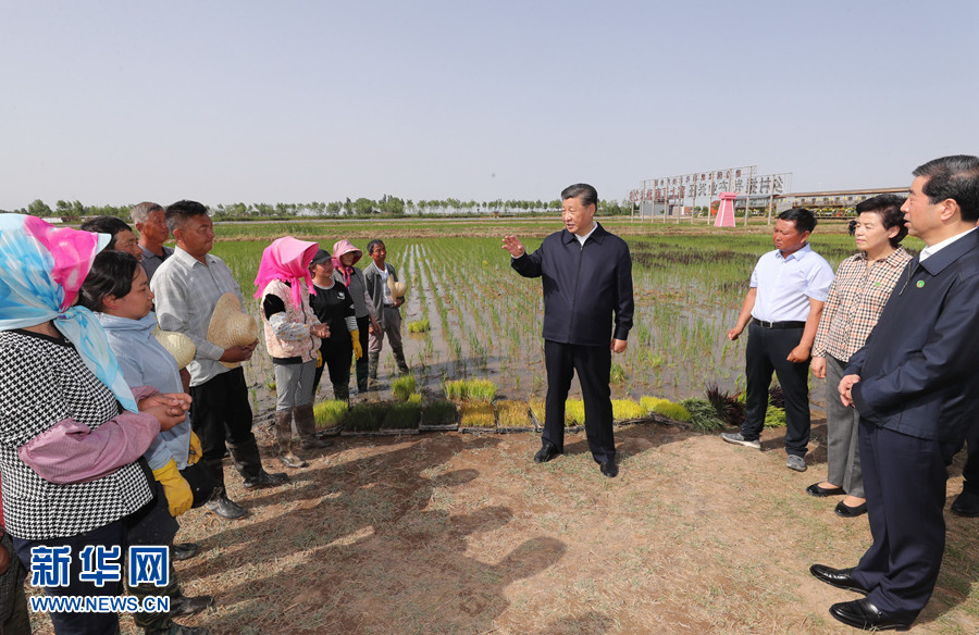 6月8日至10日,中共中央總書記、國家主席、中央軍委主席習近平在寧夏考察。這是6月9日下午,習近平在銀川市賀蘭縣稻漁空間鄉村生態觀光園,同正在勞作的村民親切交談。 新華社記者 謝環馳 攝