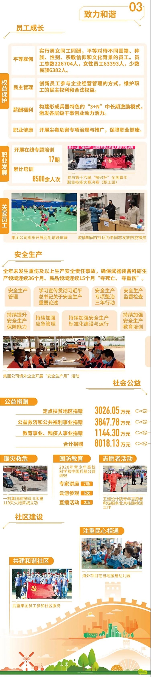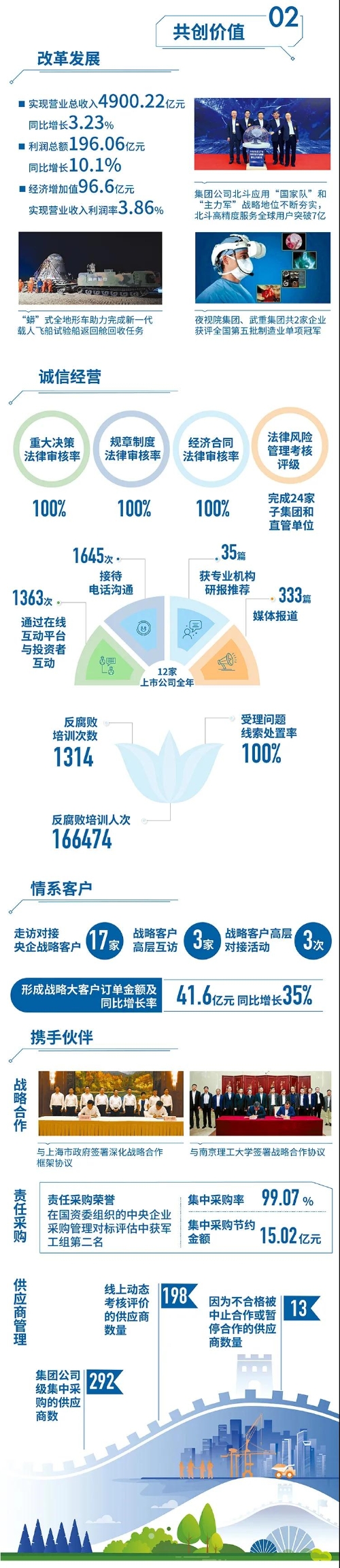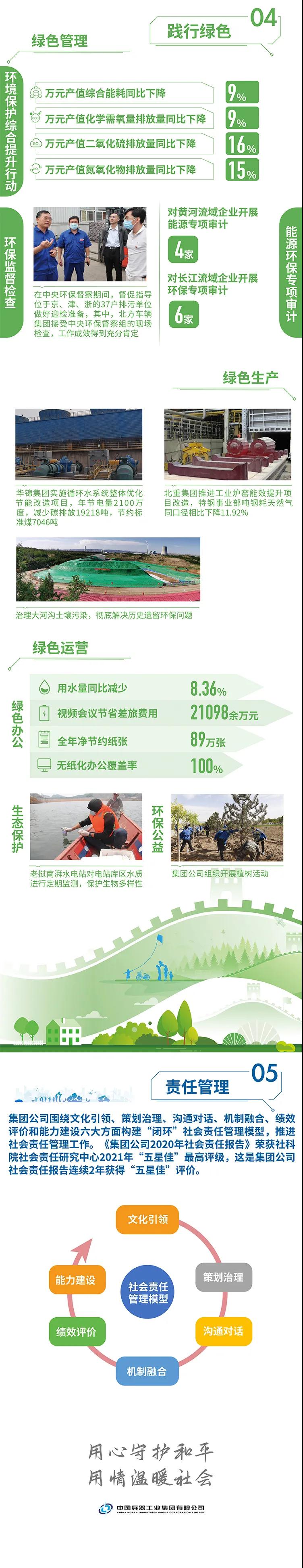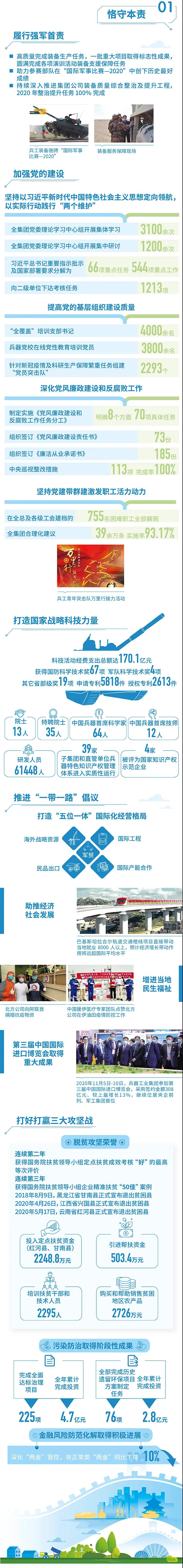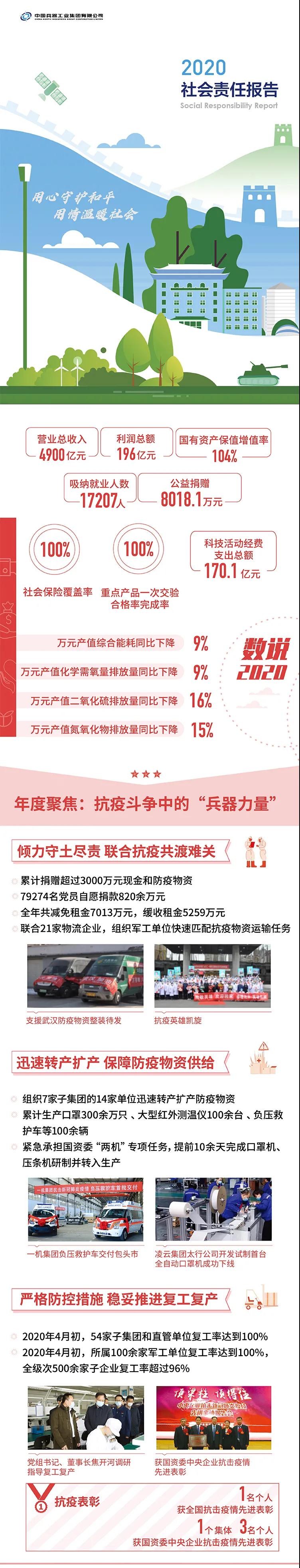 2020年,是“十三五”規劃收官之年,也是全面建成小康社會、實現第一個百年目標的決勝之年。集團公司黨組書記、董事長焦開河在報告開篇指出,集團公司實現了“十三五”圓滿收官,整體步入了高質量發展軌道,呈現出基礎更牢、動力更強、空間更大、效能更高的積極向上良好態勢。在“十三五”特別是近三年來的工作實踐中,我們明確了“集團公司是國家安全和國防建設的脊梁、是國家戰略科技力量最為重要的組成部分、是黨和國家最可信賴的‘六個力量’,肩負著支撐國防軍隊建設、推動科技自立自強、服務構建新發展格局的重大政治責任和光榮使命,具有極強的政治屬性,性質特殊、使命特殊、責任特殊”的新時代新階段職責使命,深化了對“堅持以習近平新時代中國特色社會主義思想定向領航,是集團公司高質量發展的根本遵循;保持貫徹落實習近平總書記重要指示批示和黨中央決策部署的戰略定力,是集團公司高質量發展的根本前提;履行好強軍這個首要職責,是集團公司高質量發展的根本要求;加快兵器科技創新突破,是集團公司高質量發展的根本支撐;加強黨的領導黨的建設,是集團公司高質量發展的根本保證”的兵器工業改革發展規律認識。 《報告》聚焦“抗疫斗爭中的‘兵器力量’”,生動展示了集團公司抗擊疫情的有力行動,展現了集中力量辦大事、急國家之所急的“兵器速度”,彰顯了“把一切獻給黨”的人民兵工精神和貫徹落實國家決策部署的責任擔當?!秷蟾妗芬浴坝眯氖睾蚝推健⒂们闇嘏鐣睘橹黝},從恪守本責、共創價值、致力和諧、踐行綠色、責任管理五個維度,全面展現集團公司在堅持履行政治責任、經濟責任、社會責任,履行強軍首責、加強黨的建設、打造國家戰略科技力量、推進“一帶一路”倡議、打好打贏三大攻堅戰、深化改革、助力員工成長、支持社會公益事業、提升社會責任管理等方面的生動實踐和履責亮點,凸顯集團公司保持貫徹落實黨中央決策部署的戰略定力、在聚焦主責主業、科技引領、國際化經營上持續用力,為實現第一個百年奮斗目標貢獻力量的初心與行動。《報告》再次獲得中國企業社會責任報告評級專家委員會“五星佳”最高評級,兵器工業集團成為軍工行業唯一連續10年獲得最高評級的企業。 2021年是開啟新征程的開局之年,也是建黨100周年、人民兵工創建90周年,兵器工業集團將全面貫徹落實黨中央戰略部署,緊扣推動高質量發展主題,圍繞“十四五”開好局、起好步,堅決完成黨中央賦予的職責使命,履行好中央企業和軍工集團的政治責任、經濟責任、社會責任,為實現中國夢強軍夢作出新的更大貢獻! 一圖看懂《中國兵器工業集團有限公司2020年社會責任報告》