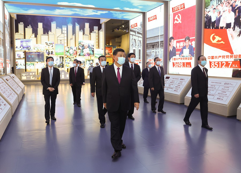 新近落成的中國共產黨歷史展覽館巍然矗立,氣勢恢宏。下午3時20分許,習近平等黨和國家領導同志來到這里,步入展廳參觀展覽。展覽以“不忘初心、牢記使命”為主題,精心設計了“建立中國共產黨 奪取新民主主義革命偉大勝利”、“成立中華人民共和國 進行社會主義革命和建設”、“實行改革開放 開創和發展中國特色社會主義”、“推進中國特色社會主義進入新時代 全面建成小康社會 開啟全面建設社會主義現代化國家新(人民日報)征程”4個部分,通過2600余幅圖片、3500多件套文物實物,第一次全方位、全過程、全景式、史詩般展現中國共產黨波瀾壯闊的百年歷程,濃墨重彩地反映黨的不懈奮斗史、不怕犧牲史、理論探索史、為民造福史、自身建設史,使人們深刻認識到紅色政權來之不易、新中國來之不易、中國特色社會主義來之不易,深刻認識到中國共產黨為什么能、馬克思主義為什么行、中國特色社會主義為什么好。