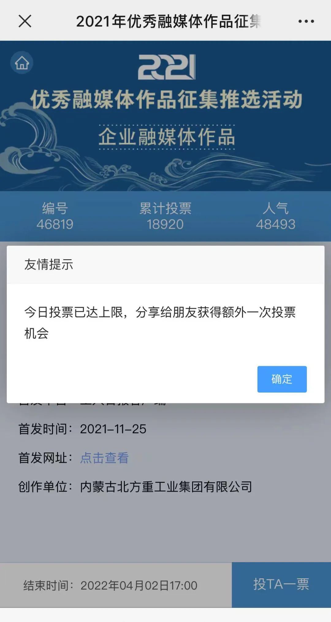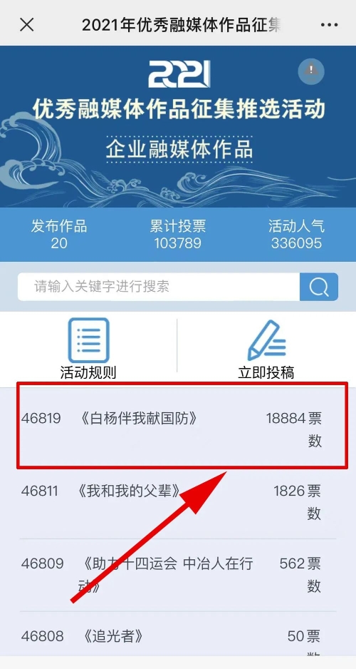 近日,由“文化強(qiáng)國(guó)”光明日?qǐng)?bào)協(xié)同推廣平臺(tái)、光明網(wǎng)、北京師范大學(xué)新媒體傳播研究中心和光明天翼5G融媒實(shí)驗(yàn)室共同主辦的“2021年優(yōu)秀融媒體作品征集推選活動(dòng)”開啟線上投票環(huán)節(jié),經(jīng)過(guò)專家委員會(huì)評(píng)審,中國(guó)兵器工業(yè)集團(tuán)北重集團(tuán)《白楊伴我獻(xiàn)國(guó)防》音樂(lè)MV入選活動(dòng)前二十名,并進(jìn)入網(wǎng)絡(luò)投票環(huán)節(jié)。 《白楊伴我獻(xiàn)國(guó)防》 楊樹參天 高聳云端的是兵工人 “履行好強(qiáng)軍首責(zé)”的壯志凌云! 深植北疆 傾獻(xiàn)沃土的是北重人 “推動(dòng)高質(zhì)量發(fā)展”的壯志豪情! 白楊樹伴著我們茁壯成長(zhǎng) 見證著我們獻(xiàn)身國(guó)防! 投票方式 1.掃描下方二維碼,進(jìn)入初始界面,點(diǎn)擊“企業(yè)融媒體作品征集”,進(jìn)入投票界面點(diǎn)擊《白楊伴我獻(xiàn)國(guó)防》,點(diǎn)擊“投TA一票”; 2. 每人每日可投10票,直至提示投票達(dá)到上限即可; 3.投票時(shí)間:2022年3月17日09:00-2022年4月2日17:00。 來(lái)源/光明網(wǎng)、北重集團(tuán) |