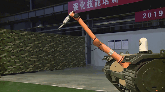搭載機械手的多功能模塊化履帶無人平臺,就像一個靈活的機器人,面對地上的障礙物,利用機械手將抓取到的危險物品,穩穩地投擲到防爆倉里,在現場無人操控的情況下,圓滿完成應急救援任務。
