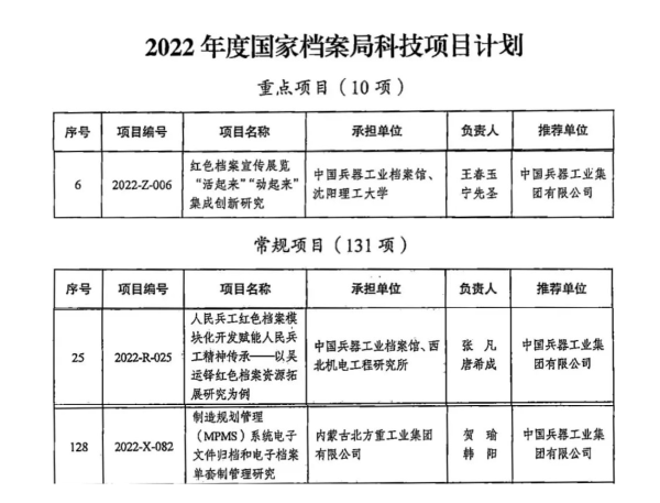 為深入貫徹落實《“十四五”全國檔案事業發展規劃》要求,著力提升檔案科研自主創新能力,根據《國家檔案局辦公室關于開展2022年度國家檔案局科技項目立項工作的通知》要求,中國兵器工業集團檔案館(以下簡稱檔案館)依據《2022年科技項目立項選題指南》,組織各單位申報成功三個檔案科技項目在國家檔案局立項,其中一個項目為國家級10項重點項目之一,排名第六,這是繼2021年在國家檔案局首次立項三個項目后的又一重大突破,標志著兵器工業檔案科研工作邁上新臺階。