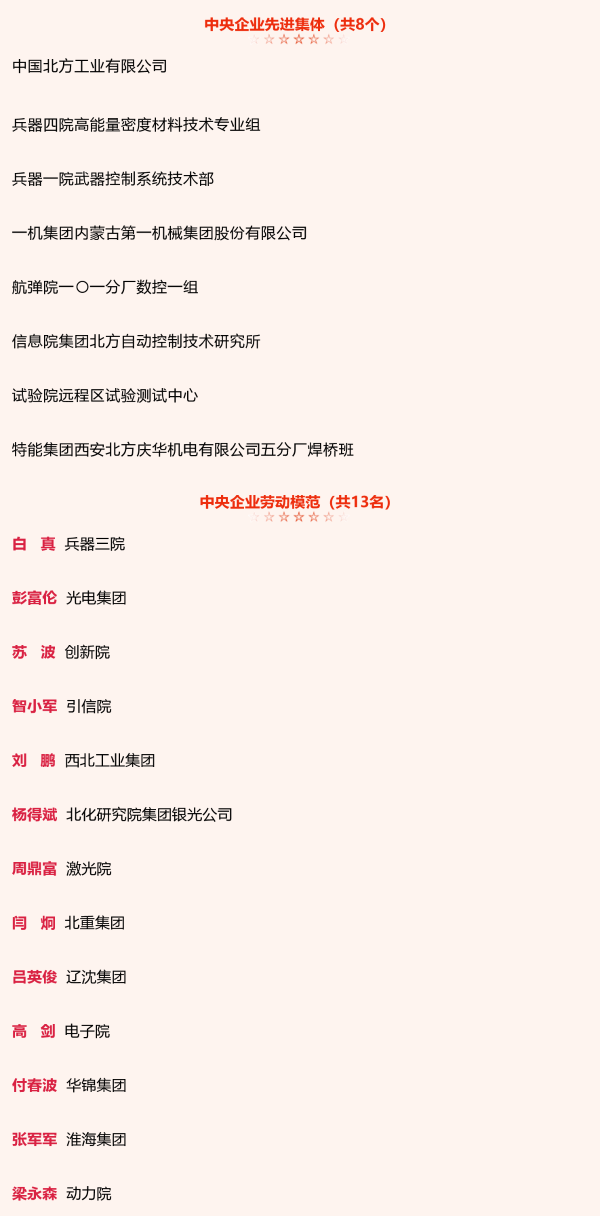 兵器工業集團8個集體和13名個人獲中央企業先進集體和勞動模范表彰 |