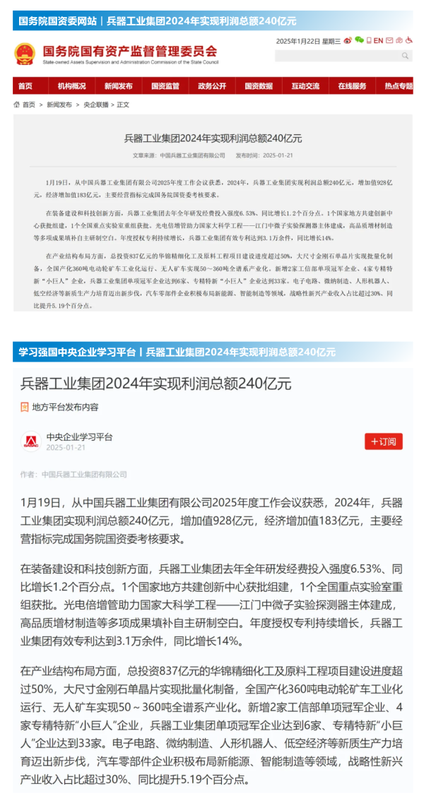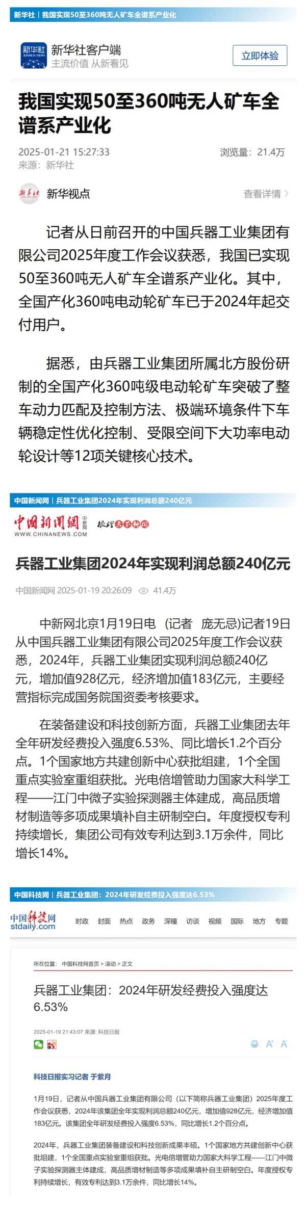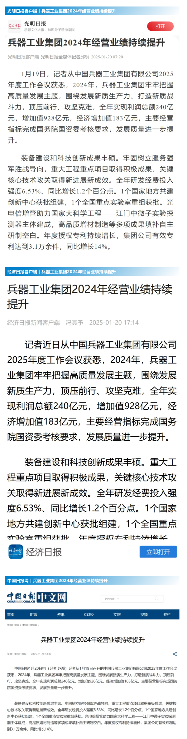 1月19日至20日,中國兵器工業(yè)集團(tuán)有限公司2025年度工作會議在京召開,會議總結(jié)2024年工作,分析形勢任務(wù),明確工作思路,部署2025年工作。 集團(tuán)公司2024年取得的成績及下一步重點工作受到社會媒體廣泛關(guān)注。新華社、中國新聞網(wǎng)、中國科技網(wǎng)、光明日報客戶端、經(jīng)濟(jì)日報客戶端、中國日報網(wǎng)、國務(wù)院國資委網(wǎng)站、學(xué)習(xí)強(qiáng)國中央企業(yè)學(xué)習(xí)平臺、新浪網(wǎng)、網(wǎng)易網(wǎng)、搜狐網(wǎng)、騰訊網(wǎng)、鳳凰網(wǎng)等中央主流媒體、國家部委網(wǎng)站及知名網(wǎng)絡(luò)媒體對集團(tuán)公司2025年度工作會議進(jìn)行了報道,重點關(guān)注集團(tuán)公司經(jīng)營業(yè)績、科技創(chuàng)新、產(chǎn)業(yè)結(jié)構(gòu)布局優(yōu)化等情況。其中,新華社以《我國實現(xiàn)50至360噸無人礦車全譜系產(chǎn)業(yè)化》為題,重點報道了集團(tuán)公司在推動智能制造水平提升方面取得的成效;中國新聞網(wǎng)、光明日報客戶端、經(jīng)濟(jì)日報客戶端、中國日報網(wǎng)等就集團(tuán)公司2024年度經(jīng)營業(yè)績及各項工作取得的成果進(jìn)行報道;中國科技網(wǎng)著重報道了集團(tuán)公司在科技創(chuàng)新和優(yōu)化產(chǎn)業(yè)結(jié)構(gòu)布局方面的最新進(jìn)展。集團(tuán)公司門戶網(wǎng)站、微信公眾號、微博等新媒體平臺以及《中國兵工報》也對集團(tuán)公司工作會議進(jìn)行了及時報道,各成員單位紛紛對相關(guān)內(nèi)容進(jìn)行轉(zhuǎn)載,引發(fā)全系統(tǒng)關(guān)注。